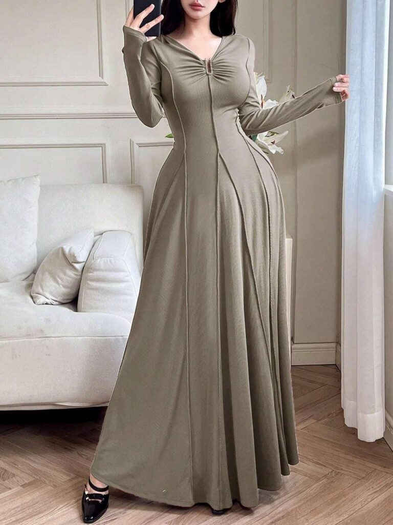 فستان نسائي طويل بيجي تصميم اكمام طويله تصميم على الجسم كلوش