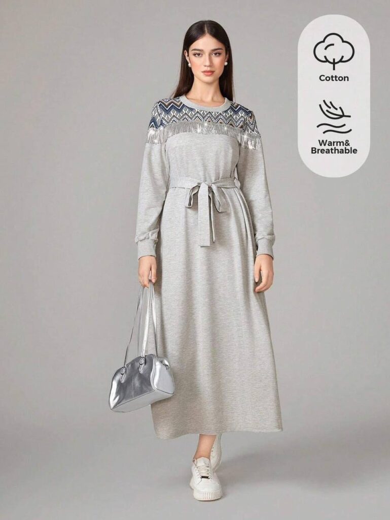فستان نسائي طويل سلفر تصميم بهاري تصميم جديد مع اكمام طويله